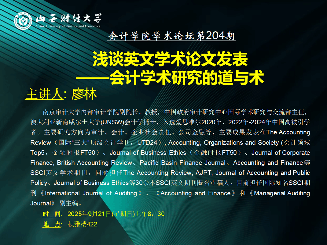 廖林教授是中国政府审计研究中心国际学术研究与交流部主任,澳大利亚新南威尔士大学(UNSW)会计学博士,入选爱思唯尔2020年、2022年-2024年中国高被引学者。主要研究方向为审计、会计、企业社会责任、公司金融等,主要成果发表在The Accounting Review(国际“三大”顶级会计学刊,UTD24), Accounting, Organizations and Society (会计领域Top5,金融时报FT50)、Journal of Business Ethics(金融时报FT50)、Journal of Corporate Finance, British Accounting Review、Pacific Basin Finance Journal、Accounting and Finance等SSCI英文学术期刊,同时担任The Accounting Review, AJPT, Journal of Accounting and Public Policy、Journal of Business Ethics等30余本SSCI英文期刊匿名审稿人。目前担任国际知名SSCI期刊 《International Journal of Auditing》 《Accounting and Finance》和《Managerial Auditing Journal》 副主编。