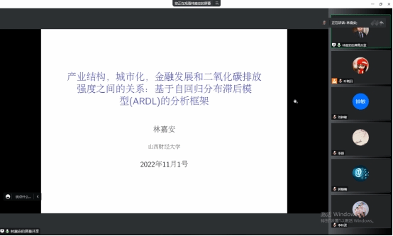 林嘉安老师分享拟申报的项目选题:产业结构、城市化、金融发展和二氧化碳排放强度之间的关系:基于自回归分布之后模型(ARDL)的分析框架。中国经济快速增长,能源消耗增加,二氧化碳排放量增加,导致温室气体增加。“双碳目标”提出,2030年之前达到碳达峰,2060年前实现碳中和,因此了解与经济增长相关的活动,比如产业机构优化、城市化、金融发展和二氧化碳排放强度之间的关系至关重要,基于此,林嘉安老师提出拟研究的问题:产业结构、城市化、金融发展和二氧化碳排放强度之间的关系。