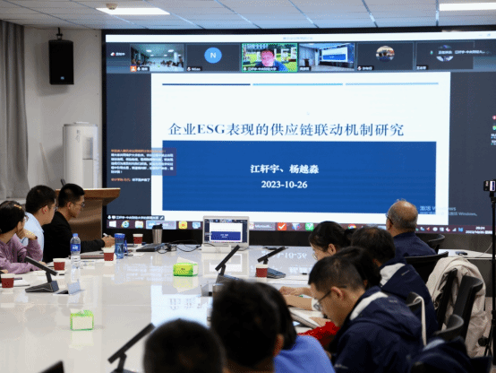 中央财经大学江轩宇教授进行了《企业ESG表现的供应链联动机制研究》主题演讲。江教授指出企业ESG表现在供应链企业问具有上下游联动效应:供应链上下游企业ESG表现的改善将显著提高焦点企业的ESG水平。随后他指出本文的三个创新点:第一,现有文献主要从企业内部特征和外部环境维度探讨了单一企业ESG表现的驱动因素,对于群体溢出效应,更多从行业同群维度展开讨论;第二,己有文献主要从绿色供应链管理行为、数字化转型、社会责任履行等角度探究供应链网络中的同群行为,对ESG履责在供应链上的互动关系缺乏关注;第三,分别从供应链价值共同体和焦点企业个体视角检验了ESG供应链联动的经济后果,有助于更好地认识和理解ESG供应链联动的价值创造效应。江轩宇教授的演讲开阔了师生的视野,进一步调动了师生的科研积极性。