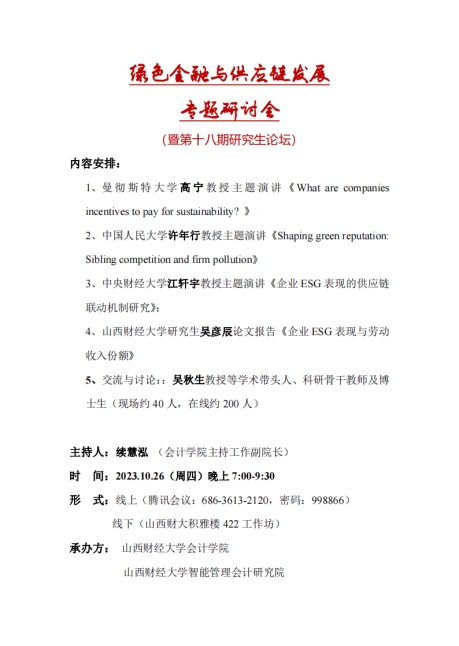 吴秋生教授,论坛特别邀请曼彻斯特大学高宁教授、中国人民大学许年行教授、中央财经大学江轩宇教授做绿色金融与供应链发展专题讲座。