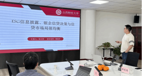硕士研究生张正普汇报,题目为《ESG信息披露、银企信贷决策与信贷市场局部均衡》。张正普同学在汇报过程中也多次提及论文在写作过程中高宁教授给予的帮助和指导,并表示非常感谢。高宁教授认为论文最后的政策建议这三个方面可以更进一步扩充相关内容并完善。