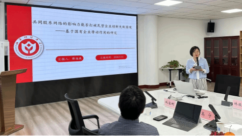 老师薛海燕汇报,题目为《共同股东网络的影响力能否打破民营企业创新失败困境——基于国有企业带动作用的研究》。高宁教授认为本文的因变量看失败率会更为准确,可比性也更强。还可以继续关注民营企业和国企合作带来哪些优势这方面的文章。薛海燕老师提问这个主题是否可以投外刊发表,高宁教授认为本文的选题具有一定的独特性,因为美国不存在这种发展模式,所以这个主题对于外刊而言具有一定的吸引力。吴秋生教授认为文章题目中的“打破”一词不是很恰当,给人一种这个问题已经完美解决的意思,建议改为“降低”。李颖教授对论文标题提出修改建议。