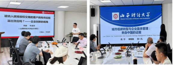 研究生牛浩洋汇报。题目为《被纳入碳排放权交易的客户具有供应链溢出效应吗?——企业创新的视角》。吴秋生教授认为文章中用倒逼效应来阐述客户和企业之间的作用效果还需要进行更深入的研究与解释;从荣刚教授认为文章还需要重新明确碳排放的概念,明确创新是内部驱动还是外部驱动;高宁教授提出建议从供应链风险层面深入分析,对题目进行进一步凝练。