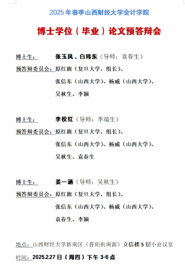 召开2025年上半年博士研究生学位论文预答辩会。预答辩委员会由复旦大学原红旗教授、山西大学张信东教授和杨威教授、hanime1