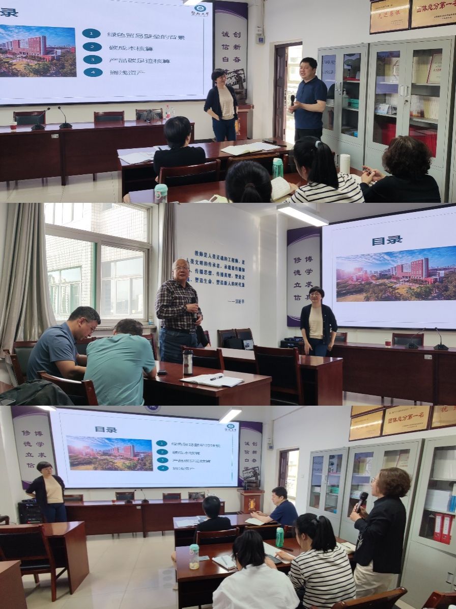 骨干教师及博、硕士研究生做专题报告,先后讲解了“绿色贸易壁垒的背景”、“碳成本核算”、“产品碳足迹核算”、“搁浅资产”四方面的内容。报告围绕全球绿色贸易新格局下的会计学科发展,从理论前沿与实践应用双重维度展开深度剖析。沈教授首先解读了欧盟碳边境调节机制(CBAM)等国际贸易新规对中国企业的深远影响,继而系统阐释了碳成本核算体系、产品全生命周期碳足迹、搁浅资产等关键议题。并通过航运业典型案例分析,生动展现了碳会计在企业战略决策中的实践价值。