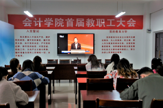 于立信楼五层大会议室组织观看“最美基层高校毕业生”先进事迹报告会,毕业生代表出席会议。